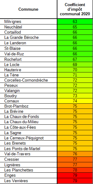 Coefficients d’impôt des communes neuchâteloises pour 2020 :